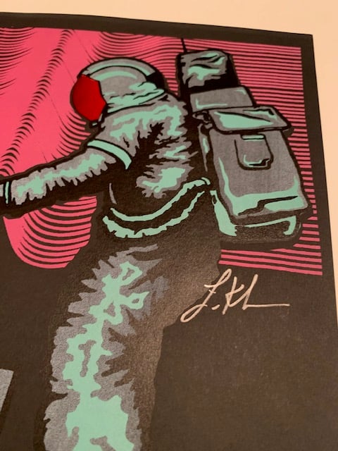 Black version. Awesome Stereolab poster. The faceshield is fold stamped. Signed by Lindsey below the astronaut. Posters will be shipped rolled.